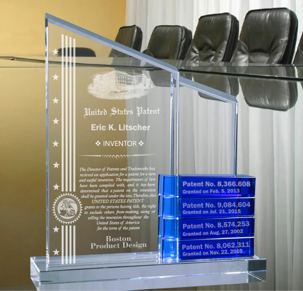 Our Innovate Crystal Desk Top Perpetual Patent Award offers elegance, reduced display space, and low cost as compared to equivalent single awards. Compared to single awards, the Innovate Desk Top Perpetual Patent Award offers a sophisticated and efficient solution for displaying multiple patents.