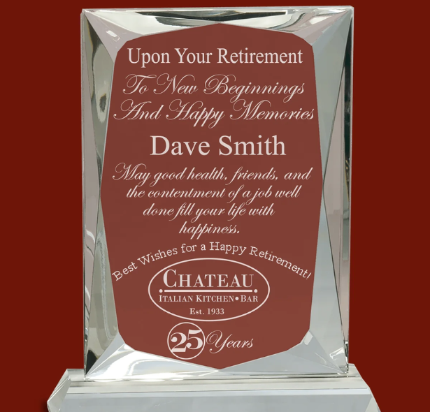 At FineEtch.com, we also offer a premium retirement award that beautifully celebrates a career of accomplishments. Retirement, being one of life's major milestones, is certainly deserving of special recognition. This elegant award is meticulously fine-etched in crystal and is presented in a stunning, high-quality presentation box, making it a perfect way to honor